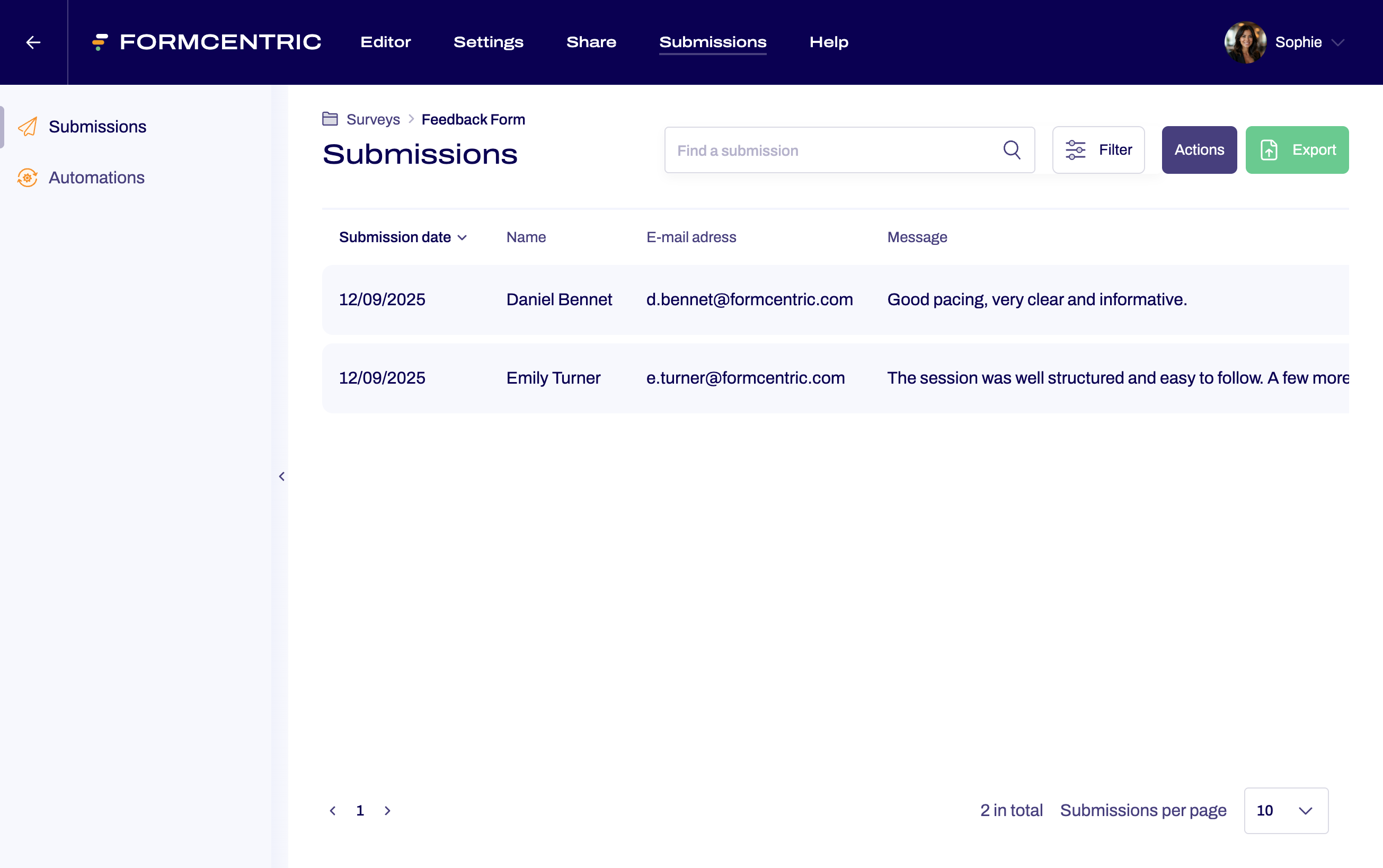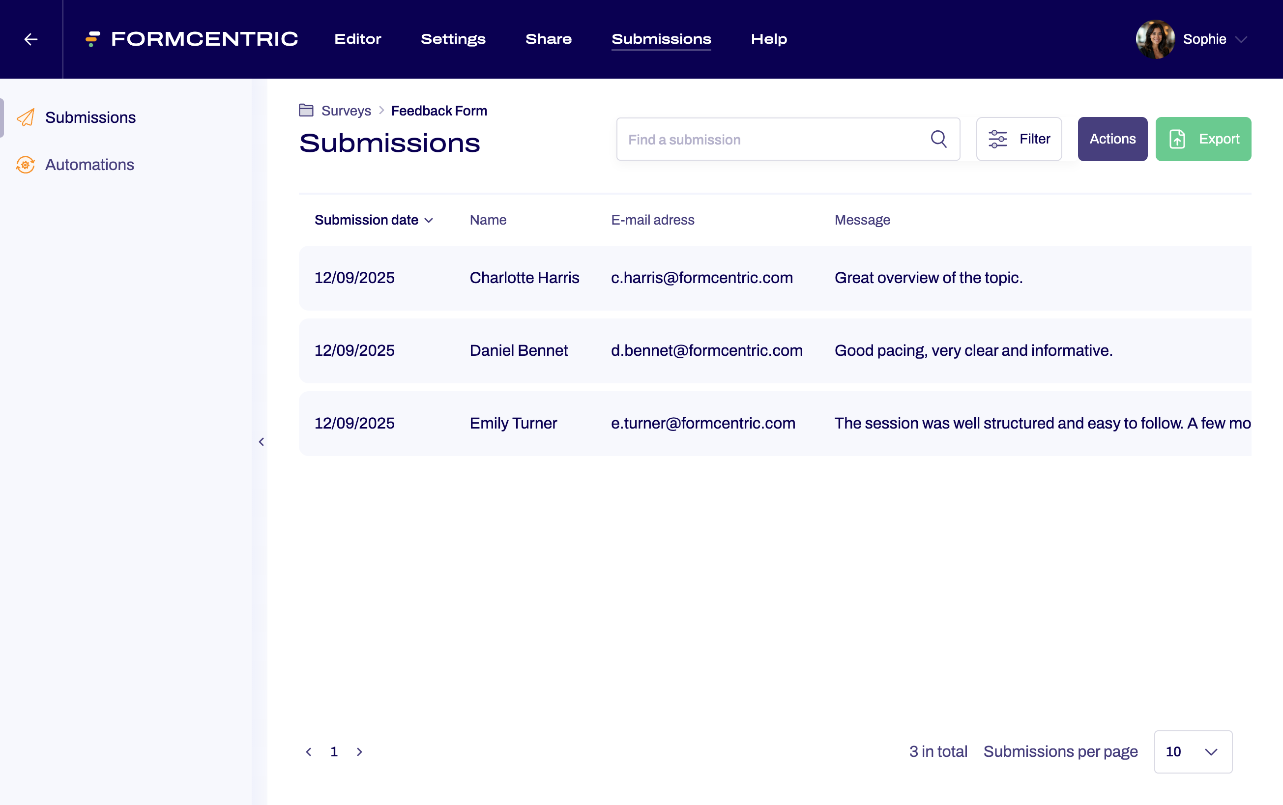 Keep all form data in view: securely stored, with clear management, custom status markers, and export functions.